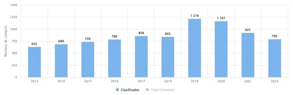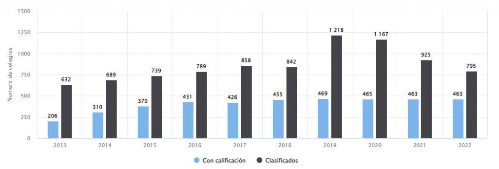 De 2013 a 2017, la tasa de crecimiento promedio de nuevos colegios clasificados fue del 8% anual. De 2019-2022, el comportamiento ha sido al contrario, con una tasa de decrecimiento promedio del -13%. En 2020, el índice general que se exigió como segundo requerimiento para que los colegios clasificaran fue de 0,78; para 2021 fue de 0,79 y, aunque se tenía previsto que para 2022 fuera de 0,80, no fue necesario debido al comportamiento negativo de los índices 2021 de más de 150 colegios con respecto a 2020, lo cual provocó su desclasificación. De 2018 a 2022, más 420 colegios han salido del ranking. Y teniendo en cuenta los actuales resultados frente a los primeros (2013), el stock de colegios solo ha aumentado en 163 colegios.