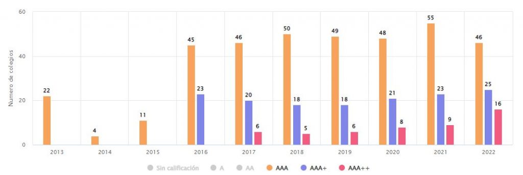 Colegios; con calificación AAA++: 16; en AAA+: 25; en AAA: 46; en AA: 193; y en A: 183.