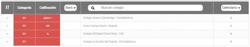 Para la primera versión 2013, solo dos colegios lograron llegar a la categoría D1. Y aunque en 2016 fueron un total de 29 colegios, la tendencia ha sido de decrecimiento en los últimos 7 años. Para la versión actual (Ranking Col-Sapiens 2022-2023) solo pudieron hacerlo 4 colegios, de los cuales 3 son del calendario B, atomizados en 4 ciudades: Floridablanca, Bogotá y Cali.