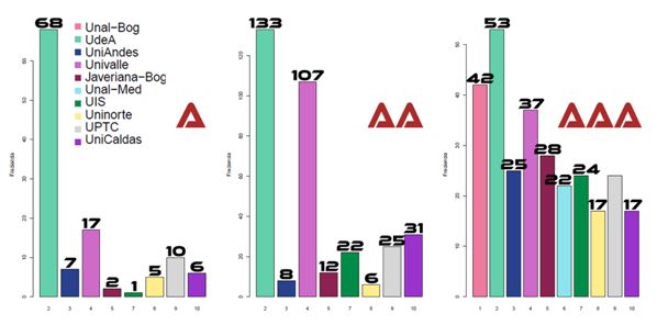 En el momento de realizar un pregrado es importante conocer cuáles IES tienen el programa que se quiere cursar y, a su vez, qué tipo de registro tiene el mismo (simple, calificado o alta calidad). Además, también es significativo el valor económico que este tiene porque es de vital importancia y, en muchos casos, es el factor que influye en si se puede estudiar una carrera profesional, tecnológica o técnica, y en qué tipo de institución realizarlo (oficial o privada), y en qué modalidad. En la actualidad, el 89% de programas se ofrece en modalidad presencial; el 5,7% a distancia y el 5,3% virtual. En la figura 1 se puede observar, por calificación (A, AA, AAA), el número total de programas de pregrado para las 10 primeras IES del Ranking U-Sapiens 2015-1. Para la calificación A y AA, se nota rápidamente la ausencia de la UNAL-Bogotá y Medellín, porque todos sus pregrados son AAA. Para la UDEA, que es la segunda en el Ranking U-Sapiens, hay presencia de pregrados en las 3 calificaciones, donde predomina la calificación AA con 133 pregrados. Según los datos recolectados, la UDEA cuenta con 254 pregrados, cifra que es 4 veces mayor que los de la UNAL-Bogotá. Por otro parte, la Universidad del Valle (Univalle), que es cuarta en el ranking, es la siguiente con más cantidad de pregrados (más de 160), de los cuales la mayoría también presenta calificación AA. Las demás universidades tienen menor cantidad de pregrados, pero en la más alta calificación: AAA.