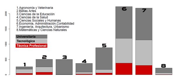 La oferta y demanda de los programas en los distintos niveles de formación de educación superior juegan un papel muy importante en la sociedad pues, con base en esto, los jóvenes deciden o no continuar con su formación académica. Según el Banco Mundial, para 2013 “el gobierno tiene como objetivo aumentar al 45% el porcentaje de estudiantes que elige el camino técnico”. En la figura 2 se evidencia que la mayor cantidad de pregrados corresponde a las áreas de conocimiento de “Economía, administración, contabilidad” e “Ingeniería, arquitectura, urbanismo”, donde hay presencia de los tres niveles de formación. Sin embargo, para “Agronomía y veterinaria”, hay muy pocos. Esto, por supuesto, demuestra que la concentración de los ejercicios laborales se enfoca más en las ciudades que en el campo, pese a que la vocación de nuestro país es el agro. Por otra parte, se evidencia que los programas referentes a las ciencias de la educación están casi en un 100 por ciento en los pregrados universitarios.