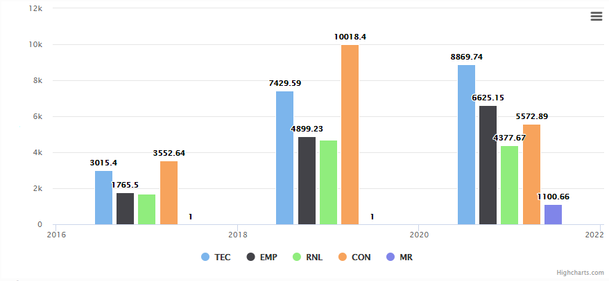 La variable que más predominó en 2017 y 2019 fue la de CON (consultorías científicas y tecnológicas). Sin embargo, esta cayó más del 44% para la versión 2021. Ahora la que predomina es la TEC (productos tecnológicos certificados o validados). De 2019 a 2021 creció más del 19%. Aunque la variable que más aumentó de puntaje fue EMP (productos empresariales), con un 35%. La variable nueva (MR) apenas representa menos del 1% del puntaje acumulado 2021 de las 5 variables. En suma, se nota claramente que las IES del país le están apostando cada vez más a la generación de resultados de productos tecnológicos certificados y validados. En esta variable, quien más se destaca es la Universidad Manuela Beltrán (Bogotá), con cerca de 500 puntos, muy por encima de IES como la Universidad Nacional de Colombia de Bogotá (+130 puntos), Universidad del Valle (+80), o Universidad de Antioquia (+70). La Universidad Simón Bolívar de Barranquilla sigue liderando en la variable EMP, con más de 570 puntos. De lejos, la Javeriana de Bogotá encabeza en la variable RNL (regulaciones, normas y reglamentos técnicos), con más de 350 puntos; la IES que le sigue es la UPTC-Tunja (+164). Con una gran ventaja, la Universidad Tecnológica de Pereira es la IES que mayor puntaje alcanzó en la variable CON (consultorías científicas y tecnológicas), con más de 468 puntos.